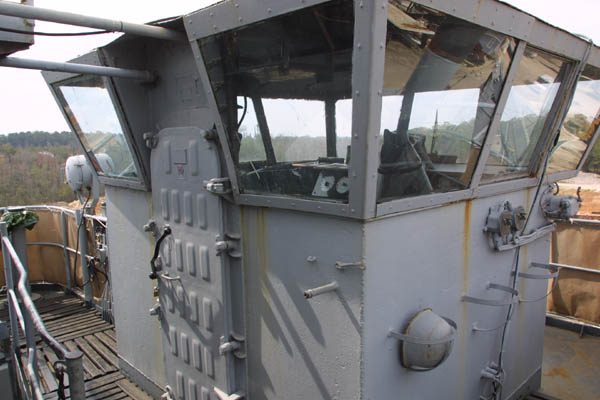 03 Deck UNDER CONSTRUCTION - The Conn is the location from which the maneuvering of the ship was overseen. From this vantage point, the Captain or Officer of the Deck can pass orders down to the wheel house. Originally this rectangular station was open with only a canvas covering to keep the sun off. Later as the ships were upgrade the conn station was enclosed as seen in the picture below, the conn aboard LST 325. On this deck one will also find 2 (two) 1000-watt incandescent Signal Searchlights; one each on the starboard and port sides of the 03 Level. The light was flashed in Morse Code (long & short light flashes) to communicate messages at long range, 6-8 miles on a clear day or night. A shutter system attached to a lever in front of the lens was used for this purpose.