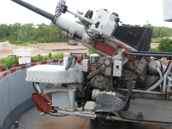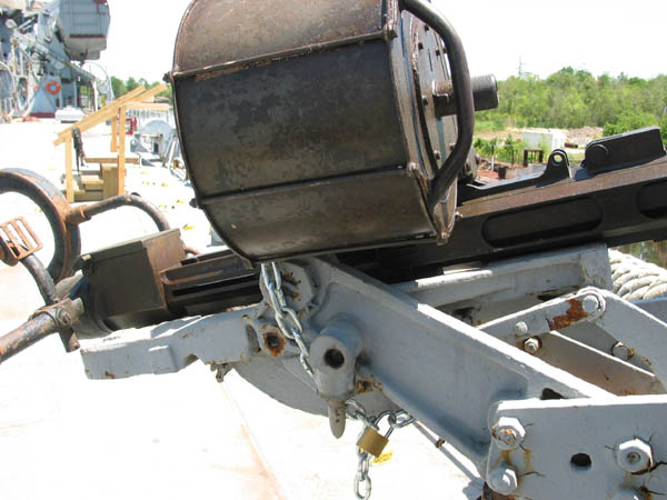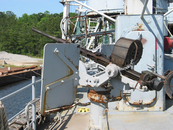 continued to rely on the .50-caliber. Ammunition was held in sixty round drums that fitted on top of the breech. After long periods of firing (about 240 rounds) the barrels had to be changed by the loaders, who wore asbestos gloves. The hot barrels were switched with spare barrels stored in cooling tanks welded alongside the guns. The ammunition drums were stored in lockers behind the gun mounts. When first placed in service in 1942, these guns were mounted singly and were aimed by open ring sights. After 1942, the lead computing stabilized MK14 relative rate gunsight was mounted on these guns for better accuracy, and added the sightrange setter. In 1945, the twin mount became common, which added two more loaders. The career of
