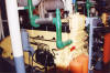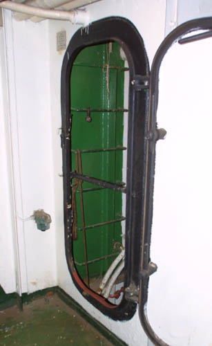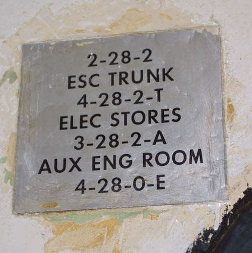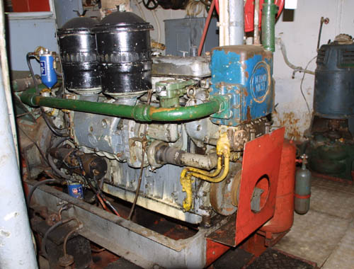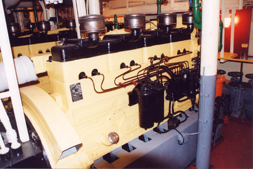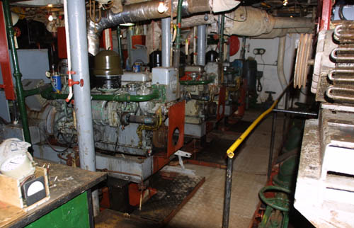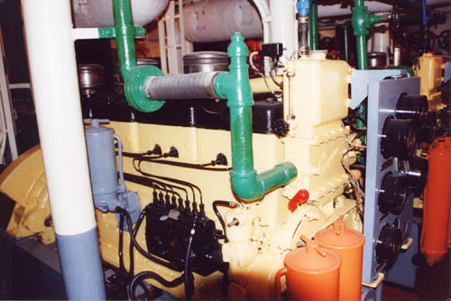 AUXILIARY ENGINE ROOM Welcome to the auxiliary engine room of an LST. This compartment is located on the fourth deck, forward of the main engine room. It is only accessible by two vertical ladders. One enters the compartment on the port side and the other from the starboard. These ladders can be accessed from the port or starboard wing deck or from hatches on the main deck. In this compartment electricity is produced to run all of the electrical equipment aboard the ship. As you step out of the access trunk you will immediately see the three auxiliary engines and the switchboard behind the engines. On the forward bulkhead are a series of valves, which control the ballast tanks aboard the ship. Beneath your feet are steel plates that can be removed in order to access the bilge. The bilge is the area between the lowest deck in the ship and the ship's bottom. Here many pipes run fuel, fresh water and ballast water all over the ship. First, shows the label at the upper end of trunk leading to Auxiliary Engine Room (explanation of labels). Second, the hatch itself. Third the view of the auxiliary engine room from the bottom of the trunk. LST's were produced with a variety of auxiliary engines. These included the Detroit Diesel Inline 6, the GM three cylinder and the Superior GDB-8. The LST 325 is equipped with the Detroit Diesel Inline 6, while the LST 393 is equipped with the Superior GDB-8. Each engine, regardless of type, is connected to a generator, which produces an output voltage of 240/120 VDC. Where AC current is required, the DC current is converted through use of a Motor-Generator set. Under normal steaming conditions, only 1 auxiliary engine was kept running. This one engine and its generator were enough to provide electricity to the lights and other necessary accessories the crew might need during a normal day. During beaching or when at general quarters all three auxiliary engines were brought online. During conditions such as these the ships demand for electricity would increase dramatically. Tank deck blower fans, the stern anchor winch, bow door and ramp machinery, ballast pumps and numerous other systems could place a heavy demand on the auxiliary engine room. Specifications: