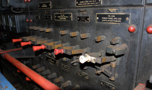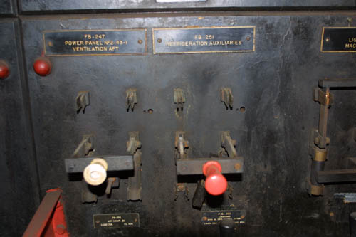 Engines: Two views of one of the Detroit Diesel Inline 6's aboard the LST 325. The third shows the GM name on the engine. (Click to see larger picture) Movies!! Click here for movies of auxiliary engine room. Two views of one of the Superior GDB-8's aboard the LST 393. (Click to see larger picture) The left picture shows a generator on the aft end of a GDB-8. (Click to see larger picture) Switchboard: The distribution of electricity is controlled through a series of six (6) power panels mounted with circuit breakers and switches comprising the switchboard. These panels run from left to right when facing the the switchboard. Below is the switchboard in the auxiliary engine room of LST 393. (Click to see larger picture) Panel #1 -- D.C. Generator #1 & Power Feeders: This panel receives power from 100-KW D.C. Generator #1, through a 500-Ampere D.C., 3-Pole, 3-Coil, type “KB” A.C.B. Circuit Breaker equipped with reverse current trip and “Hold- In” device. Mounted on this panel are instruments, and instrument switch, and generator field rheostat and three (3) power feeder circuits. D.C. ammeters with their shunt indicate the current in the positive and negative generator cables. Facing the front of the switchboard, the ammeter on the right indicates current in the positive cable, and the one on the left indicates the current in the negative cable. The voltmeter may be used to indicate either generator or bus voltage. By turning the eight-stage voltmeter switch to positions #1, #2, or #3 the generator voltage is indicated. In positions #4, #5 and #6 the appropriate bus voltage is indicated. Panel #2 -- D.C. Generator #2 & Power Feeders: This panel receives power from 100-KW D.C. Generator #2, through a 500-Ampere D.C., 3-Pole, 3-Coil, type “KB” A.C.B. Circuit Breaker equipped with reverse current trip and “Hold- In” device. Mounted on this panel are instruments, and instrument switch, and generator field rheostat and three (3) power feeder circuits. D.C. ammeters and voltmeter on this panel operate exactly the same as on the Panel #1. Panel #3 -- D.C. Generator #3 & Power Feeders: This panel receives power from 100-KW D.C. Generator #3, through a 500-Ampere D.C., 3-Pole, 3-Coil, type “KB” A.C.B. Circuit Breaker equipped with reverse current trip and “Hold- In” device. Mounted on this panel are instruments, and instrument switch, and generator field rheostat and three (3) power feeder circuits. In addition to the ammeters and voltmeter on Panel #1, and #2, this Panel contains an ammeter with zero-center scale to indicate current in the neutral ground connection. The voltmeter is a twelve-stage switch, and positions #1, #2, or #3 indicate generator voltage. Positions #4, #5, or #6 indicate bus voltage. Positions #7, #8 or #9 indicate shore power voltage. Panel #4 -- D.C. Power Feeders: This panel receives power from the generator bus and may be fed from either generator running separately or any combination of generators operating in parallel. On the top section are mounted two (2) type “KB” A.C.B. Circuit Breakers. One of these is a 400-Ampere D.C., 2- Pole, 2-Coil, manually operated for the stern capstan feeder. The other breaker is a 350-Ampere D.C., 2-Pole, 2-Coil, manually operated for the ventilating tank space feeder. On the lower section are mounted fourteen (14) fused knife switches for 2-wire feeder circuits. Ten (10) for active circuits and four (4) spares.