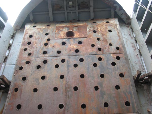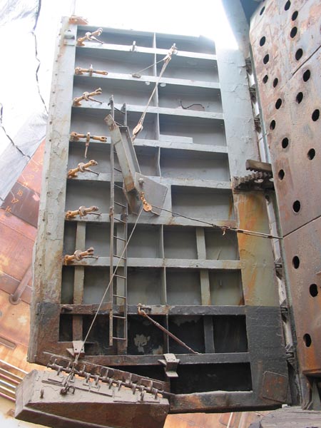 tank deck is 13 feet high and 15 foot wide. The ramp gate equipment consists primarily of a main shaft mounting two wildcats at