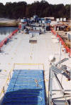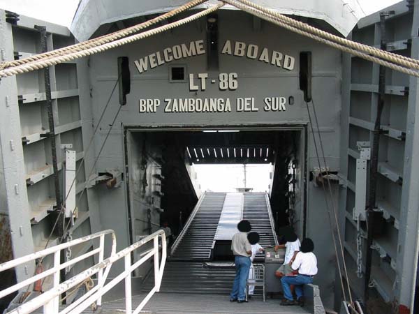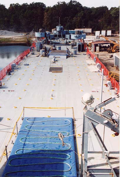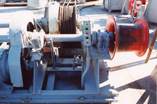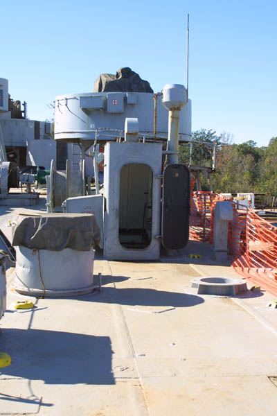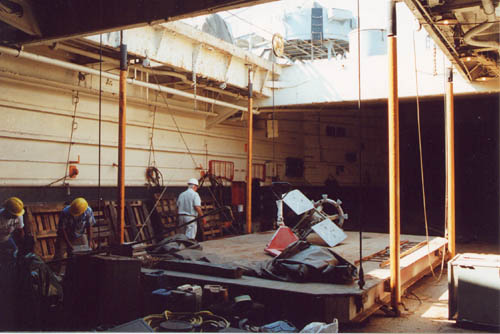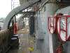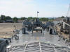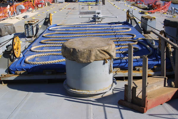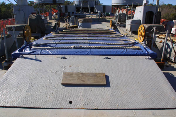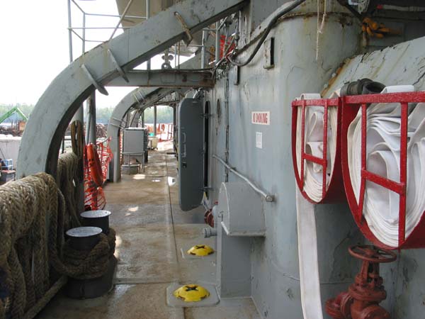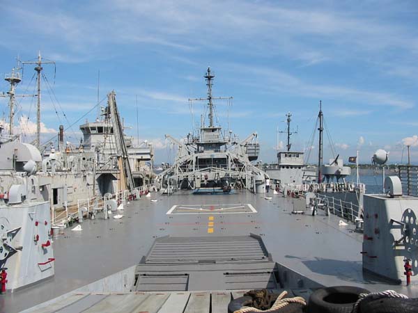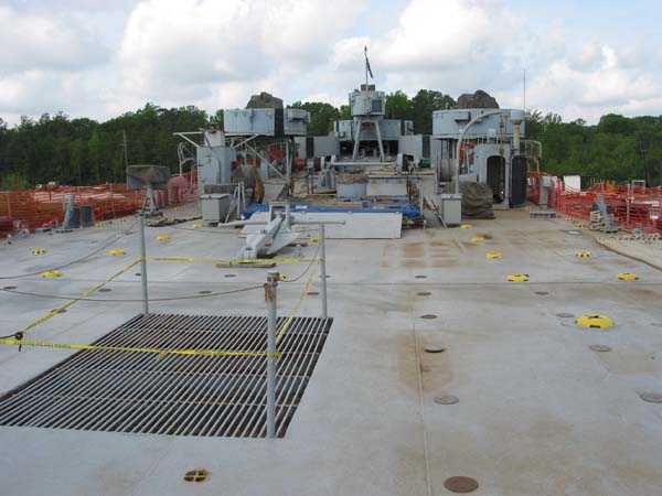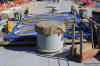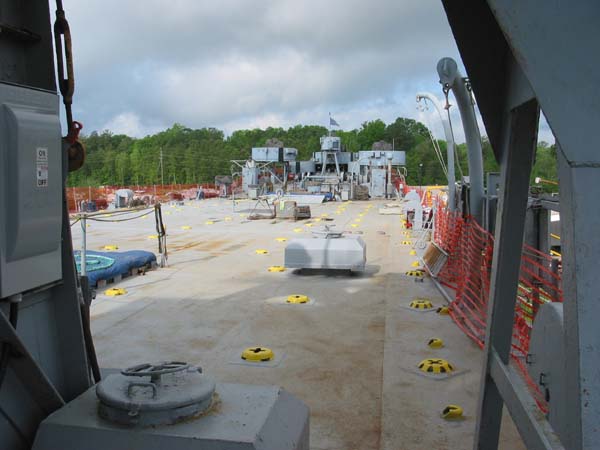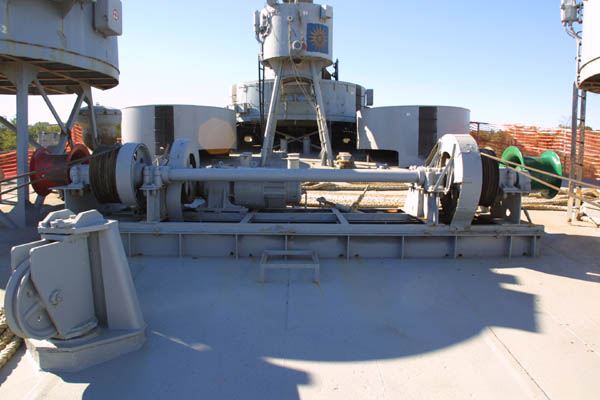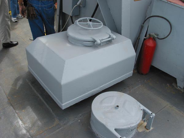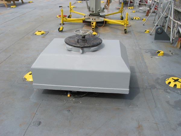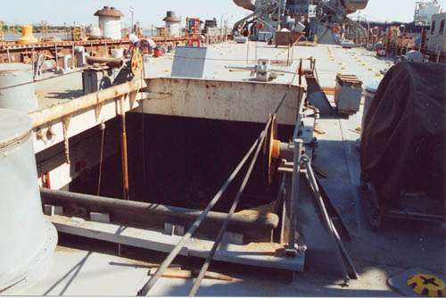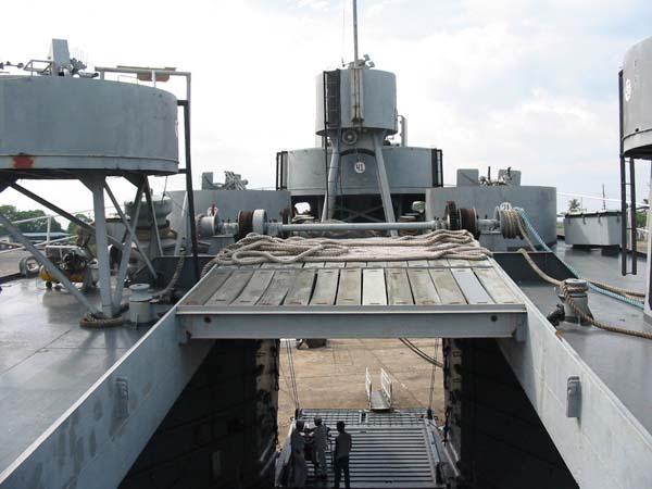 Main Deck The Main Deck of any ship is best described as the uppermost complete deck. The main deck of the LST is different then that of most ships. It was constructed without a crown, or in other words completely flat. Although this design facilitates storage of cargo on the main deck, it creates a problem with water accumulation. The flat deck also saved time and money during construction. Scattered over the main deck are clover leaves or cletes. These are used to lash vehicles and cargo down to the main deck. Also called cleats they are formed from 3/8” thick stock and measured 2-1/2” high with a 14-7/8” diameter. The center cloverleaf was a 6-1/2” diameter circle with a pattern of an “X” using a 7/8” radius at the base of the lobes. The upper deck was designed for 10-ton gross vehicle weights, and many times this was exceeded, which then required weight-spreading chocks to be used. Another prominent feature of the main deck are the four mushroom shaped hatches. Two of these hatches serve as escape trunks from the main engine room; while the other two serve the auxiliary engine room. Their distinctive shape does serve a specific purpose. These also serve to provide the fresh air necessary for the main and auxiliary engines. The mushroom shape forms an overhang. The overhang is open allowing air to pass under the overhang, over a half-wall and down the trunk into the engine room. Elevator / Ramp At the forward part of the ship you will observe either a ship’s cargo elevator, or on later LST's, the cargo ramp. This equipment was used to transfer cargo between the main deck and the tank deck. The pictures below show the LST 325's elevator in the down position and the controls for the elevator. The elevator was supplied by Warsaw Elevator Co, Warsaw, New York and was designed by Gibbs & Cox, New York, New York. The following pictures demonstrate the cargo elevator. Elevator First and second pictures, the elevator in the up position, secured in place. Third, the elevator lowered to the tank deck. Fourth, view of the lowered elevator from the tank deck. Fourth, elevator controls and motor details. Fifth, another view of the elevator equipment. Ramp These photos show the ramp in the lowered position.