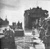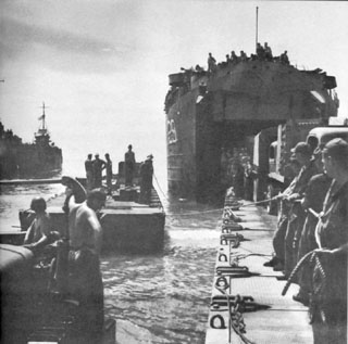 Pontoons This information from - http://www.nfesc.navy.mil/amphib/causeway/past.html The idea to use hollow, sheet steel boxes as pontoons and pontoon-assembled structures originated in 1935. The standard pontoon unit and the principle of stringing such units together was developed in 1939 by Captain John N. Laycock of the Bureau of Yards and Docks and subsequently tested during 1940 and 1941. [Note: further information can be found in "The Seabees of World War II" (ref. 1) and the Pontoon System Manual (ref. 2).] When the United States entered World War II, the Navy was faced for the first time with the problem of landing and supplying large forces where conventional harbor facilities were occupied by the enemy. Naval officers conversant with invasion landing problems foresaw that many problems could be solved with assemblies of pontoon strings and conceived that they might be used for wharves, docks, piers, lighters, tugs, and special-duty barges. The importance of the contribution to the war effort made by the Seabees and their pontoons cannot be overemphasized. During World War II, PHIBCBs were designated Naval Construction Battalions, Pontoon, and were generally called Pontoon Operating Battalions. Pontoon-barge-mounted 75-ton booms unloaded PT boats from carriers under the noses of the Japanese in the Solomons. Pontoon-floating drydocks serviced damaged small craft in many parts of the world. Barge-mounted cranes deepened harbors, and loaded and unloaded vessels. In the campaigns of Sicily, Normandy, Italy, and the Philippines, causeways were indispensable in the rapid unloading of vehicle-borne cargo from LSTs. Rhino and smaller barges ferried cargo ashore, and pontoon tugs retrieved broached craft from the beaches, helped tow barges, and assisted in the installation of piers and wharves. All over the world, pontoon piers, wharves, and bridge units were used to create harbors or to increase the facilities of existing ones. It was learned during the invasion of Sicily that pontoon causeways provided an excellent method of rapidly unloading vehicle-borne cargo from LSTs. The shallow water of the southern beaches of Sicily effectively prevented LSTs from moving in close enough to shore to discharge troops and cargo. Consequently, the enemy made preparations for an assault from the North where the water was deeper. By using causeways between LSTs and the shore, allied troops and cargo were landed on the southern beaches and achieved the element of surprise. Click photo to enlarge.